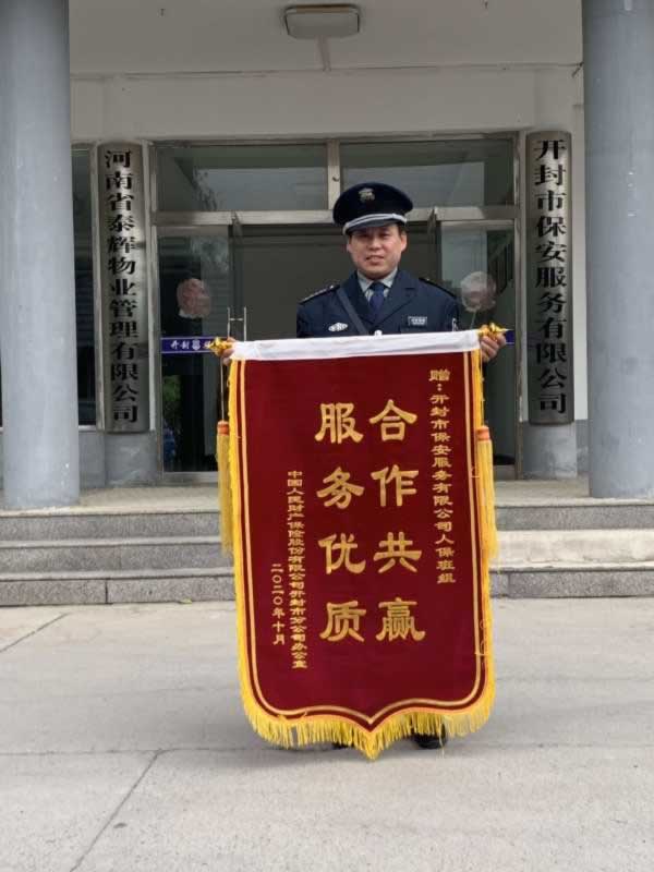 2020年10月26日上午,人保財(cái)險(xiǎn)公司辦公室一行3人為開封市保安服務(wù)有限公司送來(lái)一面上書“合作共贏,**服務(wù)”的錦旗,對(duì)公司保安一部駐人保財(cái)險(xiǎn)班組的工作給予了充分的肯定,對(duì)班組隊(duì)員積極認(rèn)真的工作作風(fēng),熱情周到的服務(wù)提出了表?yè)P(yáng)。